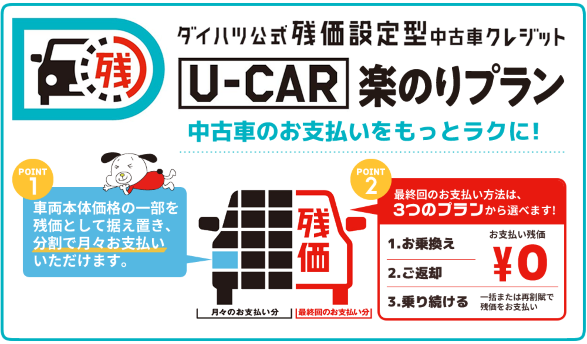 ※1最終回のお支払いは、販売会社でダイハツの新車または中古車にお乗換えの場合、または車両をご返却いただく場合は、基本的に必要ございませんが、その際の車両状態が、事前に定めた規定外の場合は、別途清算金を頂戴いたします。